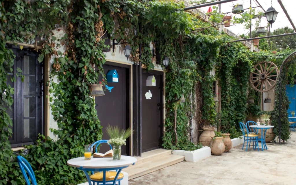 Areas by the rooms are covered with hanging ivy and decorated with vintage agricultural tools representing the agricultural heritage of the Bekaa.